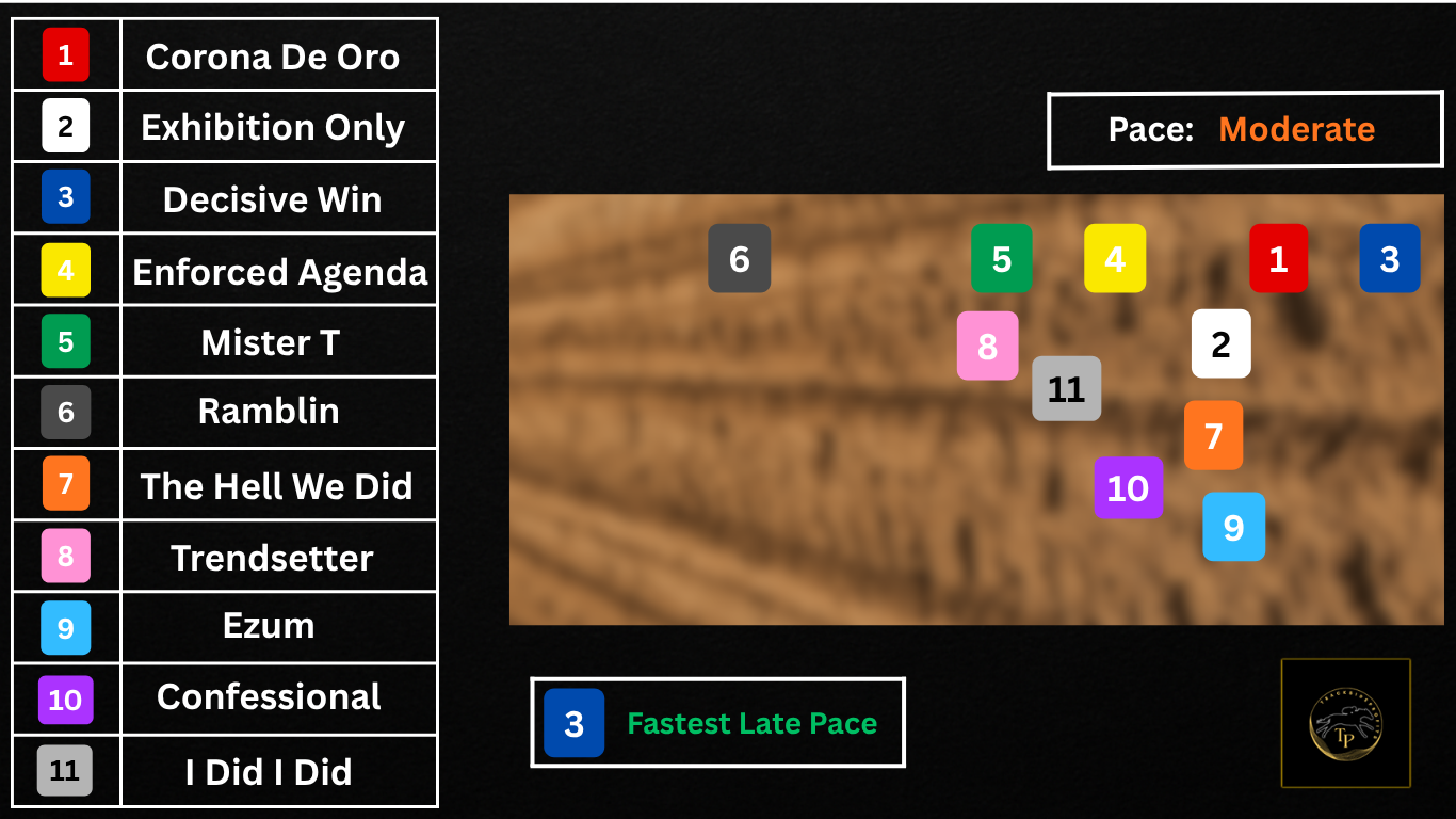 Decisive Win is expected to take the early lead, but multiple horses—Corona De Oro, Ezum, Confessional, The Hell We Did, and Exhibition Only—will press the pace. Pressure up front can lead to breakdowns, creating opportunities for tactical horses and closers. Mid-pack runners like Mister T., Trendsetter, and I Did I Did will look to capitalize, while Ramblin will attempt a late surge.